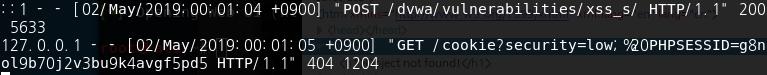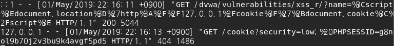 XSS 공격 수행 결과, access_log가 갱신되어 쿠키값이 출력된 것을 확인할 수 있다.