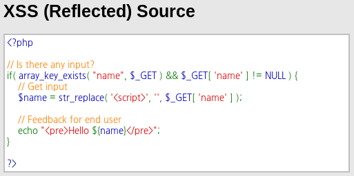 Medium Level에서는 str_replace 함수를 사용해 <script> 문자열을 지움으로써 XSS 공격에 대비한다.