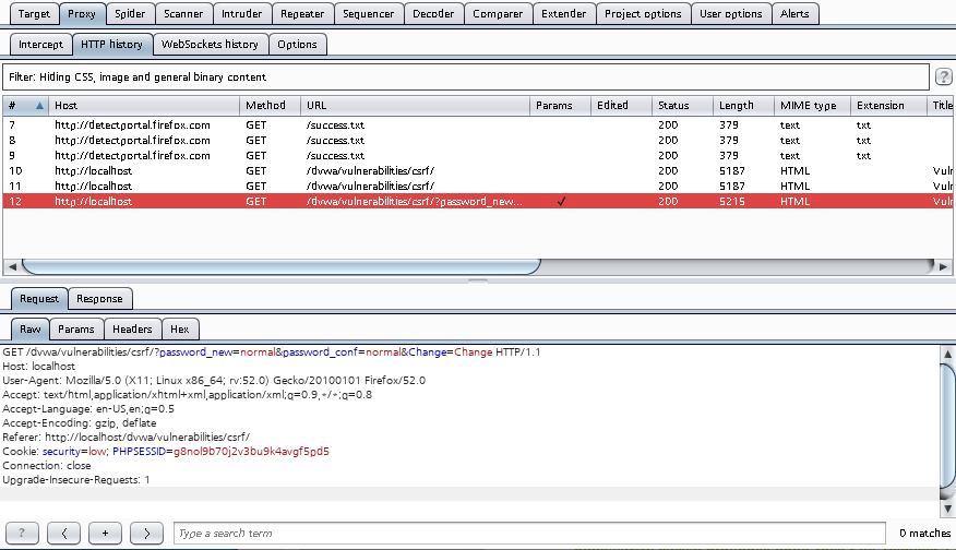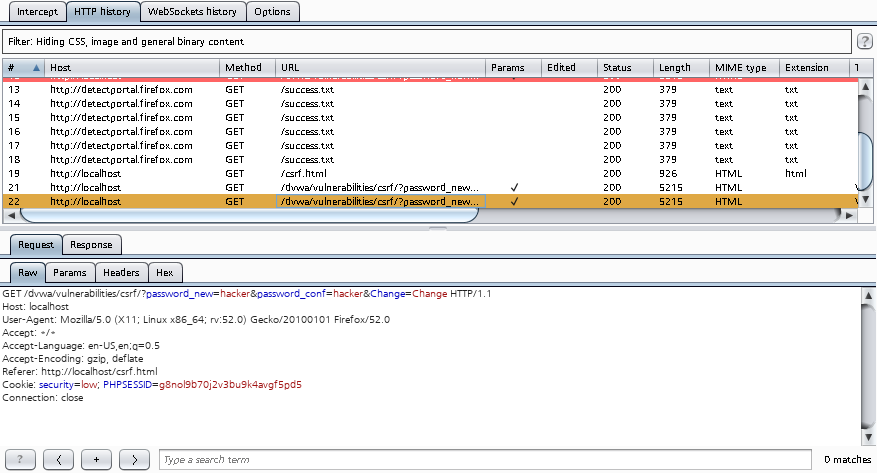 csrf.html 내용 localhost로 csrf.html을 실행한 뒤 Burp Suite를 확인해보면 password가 hacker로 바뀌어있는 것을 확인할 수 있다. csrf.html이 실행된 부분도 Highlight로 표시해준다.
