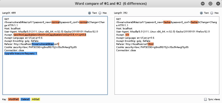 localhost/csrf.html 실행 Highlight된 두 부분을 Comparer로 보내 (send to comparer) 비교해본다. password 외에도 Referer header가 차이가 나는 것을 알 수 있다. Referer header는 해당 요청을 링크하고 있던 이전 웹페이지의 주소를 알려주는 헤더이다.