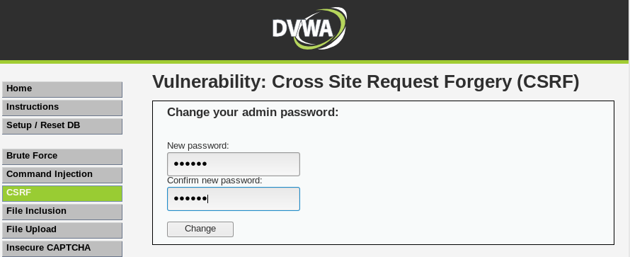 Impossible Level에서는 기존의 패스워드를 다시 한 번 입력받아 사용자 본인이 직접 기능을 실행하는지 확인함으로써 CSRF 공격을 방지한다.