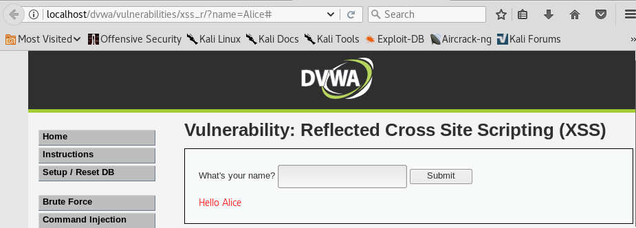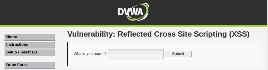 DVWA - Reflected XSS (Security Level: Low) 이름 입력 칸에 정상적으로 이름을 입력하면, 이름과 함께 인사말이 출력된다.