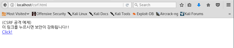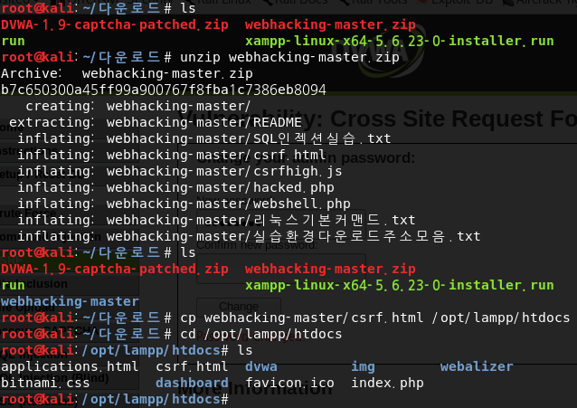 그 다음 https://github.com/SecuAcademy/webhacking에 있는 파일을 다운받은 후 압축을 풀어 csrf.html 파일을 /opt/lampp/htdocs에 복사한다.