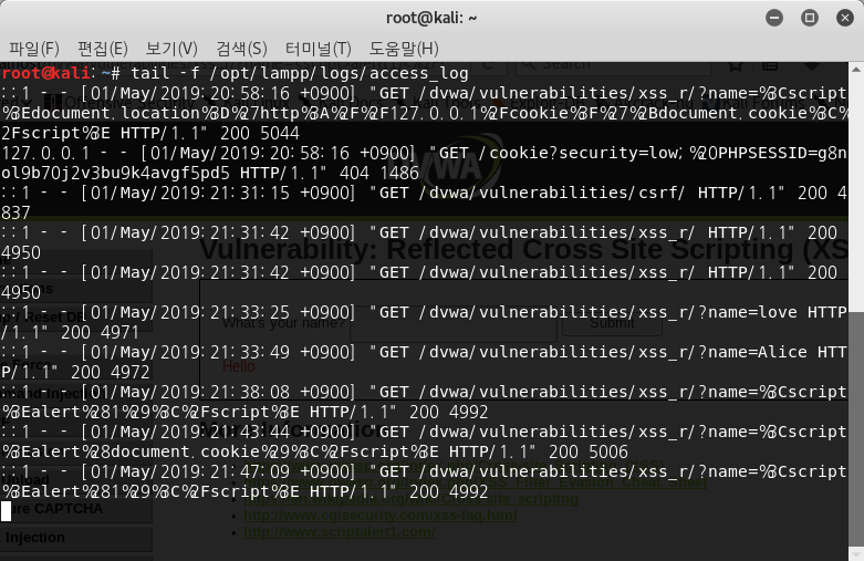 갱신된 access_log에 저장된 쿠키 ** Stored XSS 실습을 한 뒤에는 Setup/Reset DB 메뉴에서 DB를 초기화해주자.