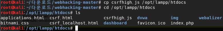 먼저 아까 다운받은 webhacking-master에서 csrfhigh.js 파일을 /opt/lampp/htdocs 폴더에 복사하여 저장한다.