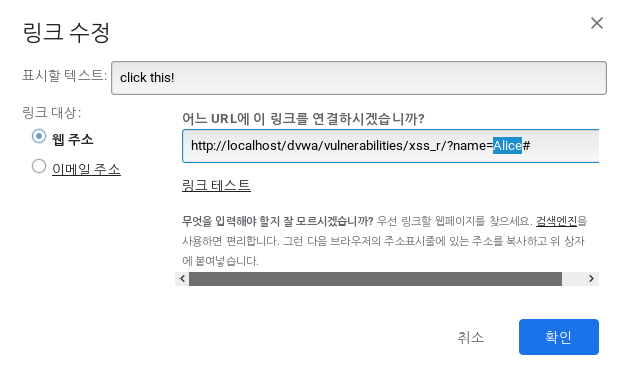 그런데 앞에서처럼 요청에 직접 스크립트 태그를 넣으면 사용자가 쉽게 알아챌 수 있기 때문에 피싱을 통해 사용자를 속여야 한다.