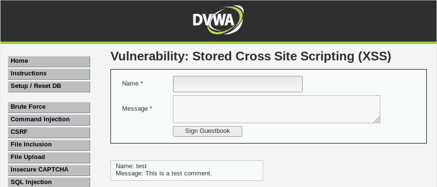 그 다음, Security Level을 Low로 변경하여 XSS(Stored)에 들어가서 아래와 같은 스크립트 코드를 입력한다.