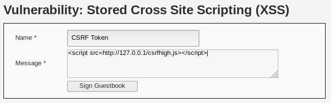 다시 Security Level을 High로 변경한 뒤 XSS(Stored)로 들어가면 csrfhigh.js가 실행되어 token을 보여준다. 이 token은 XSS(Stored)에 재접속할 때마다 변경된다.